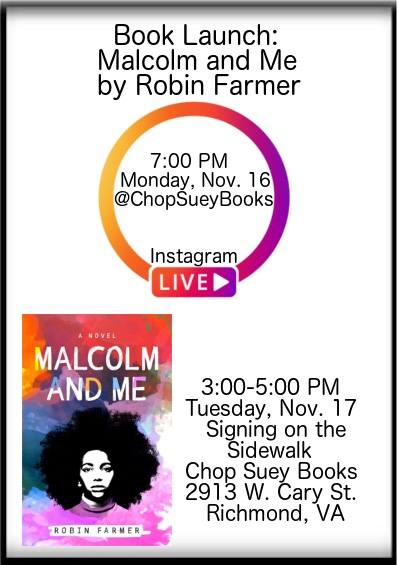 Malcolm and Me: A Novel is available at a variety of outlets that include Amazon, Farmer’s website, robinfarmerwrites.com, Target, bookshop.org (the online alternative to Amazone that lets book lovers support local booksellers), and at Chop Suey Books in Carytown. Farmer will will participate in an online interview with Chop Suey on Instagram on Monday, November 16, and sign books outside of Chop Suey on November 17 and at 7 p.m.