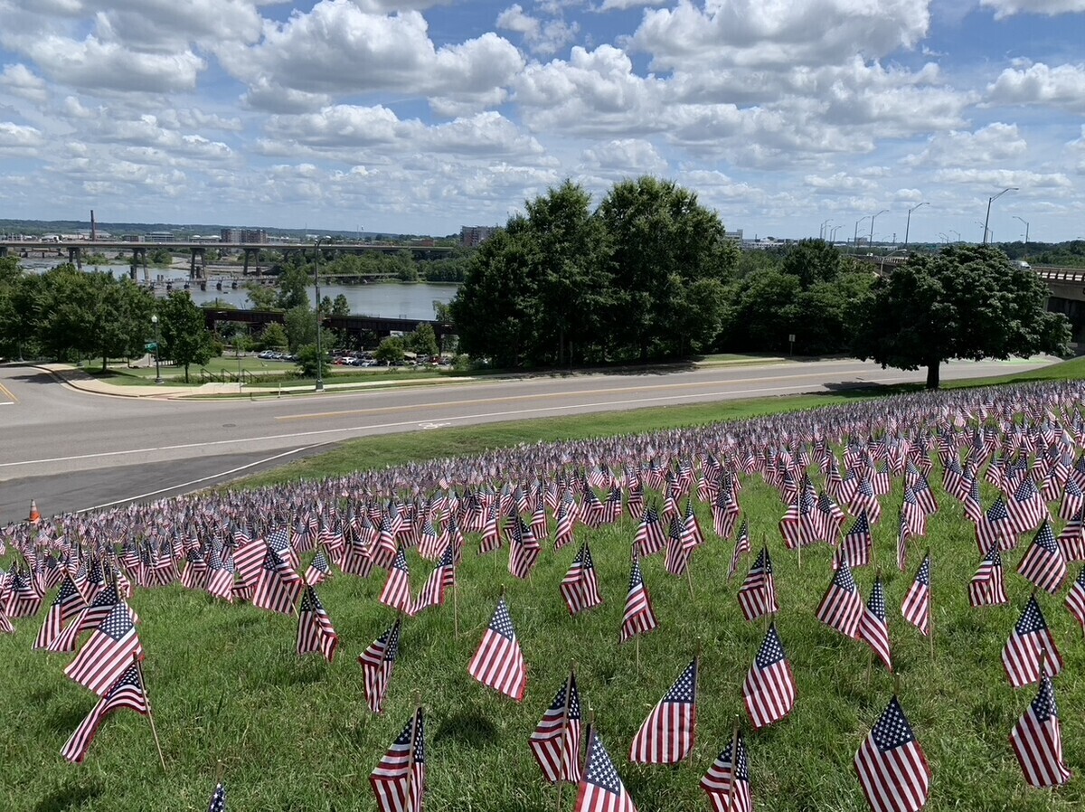 Friday, July 16, at eight o’clock in the morning, volunteers are needed to help remove the 12,000 flags from the Hill of Heroes, that were installed to remember the names on the shrine. Individuals and groups are welcome. Those wish to help should meet in the Memorial’s Shrine of Memory for instructions. Free parking is available at the Memorial which is located at 621 South Belvidere Street, just north of the Lee Bridge.