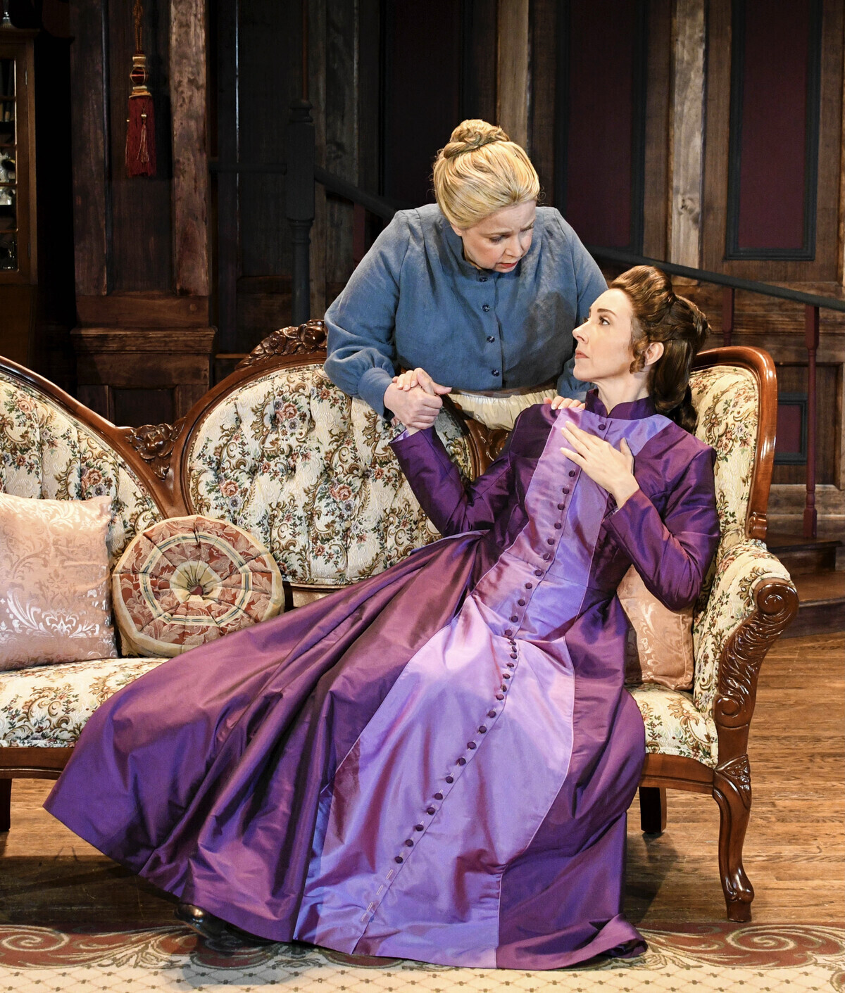 As Mr. Manningham, Burtness is a rollercoaster of moods that leave his wife walking on eggshells. In one moment, he is showering her with affection and delighting her with plans for a special outing. In the next, he is icily demanding that she correct a problem he won’t even identify, leaving her to frantically guess what has made him so angry. His swiveling from tenderness to fury and back again bring the audience into his wife’s confusion.