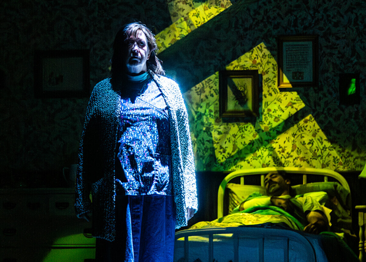 Beyond these textual qualms, there are a lot of excellent parts of this production that enhance the story’s strongest qualities and make Virginia Rep’s Misery an entertaining ride. The clever introduction sets the audience at ease – then the production uses the total darkness of the November Theatre to great effect to force-restart the room’s atmosphere. Phenomenal lighting and projection design by BJ Wilkinson and Dasia Gregg, respectively, contribute to the storytelling at every turn. These visual elements add a lot of texture and communicate important information about mood and the passage of time. Even warm light is utilized in ways that feel disconcerting and eerie, making the house somehow feel especially dark and abandoned at night. Joey Luck’s sound design enhances the sense of dread with humming and thrumming. Those droning noises are thoughtfully balanced with moments of complete stillness and silence, which are even more anxiety-inducing.