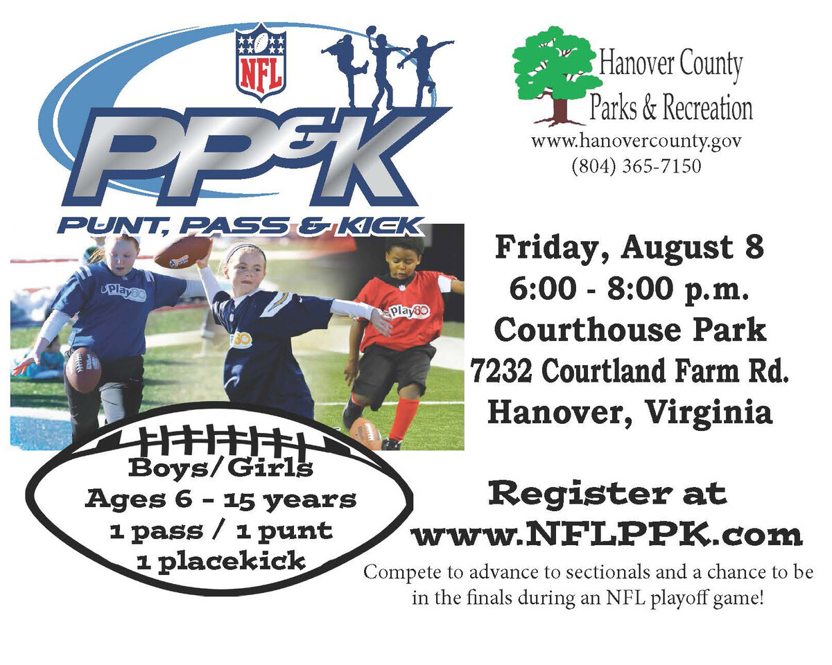 Hanover County Parks and Recreation invites female and male youth, ages 6-15 years to the NFL’s Punt, Pass and Kick competition. This free event will allow participants to successfully throw…