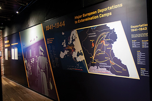 Following a path of painted railroad tracks inside the museum, we are transported through history. Each room is a vivid model of historical events representing Hitler’s reign over Jews and other minorities. Kristallnacht (or the Night of Broken Glass: Germany, 1938) appears as a movie set. Here, we walk through a Jewish community in chaos – the windows of homes, stores, and synagogues shattered. That night, during acts of violence incited by Nazis, numerous Jews were assaulted or killed, and others were transported to concentration camps.