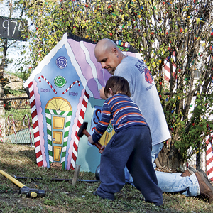 He and his wife, Bobbie, begin putting up lights for both houses in the middle of September. His two daughters, Katelyn, 13, and Chelsea, 15, also help out. “A week or two before we put them up we will pull things out and fix them,” he says. “Our back room is the Christmas hospital where we do repairs.”
