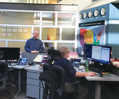 Located in the middle of the UNOS building, the Organ Center resembles what you might think of when you envision a mission control-style command center. Clocks with all time zones line the walls. A large custom map shows different UNOS regions across the country. The map also designates cities with airports that UNOS uses so organs can be transported for life-saving surgeries.