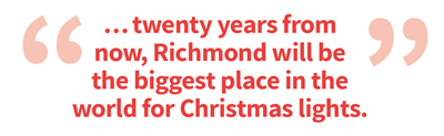 Not only has the list of homes grown, but Richmond has received substantial recognition for its tacky lights. The city’s lit-up houses were featured in a 2006 episode of Crazy Christmas Lights on TLC, and Richmond has appeared on several national lists of cities with the best tacky lights, including those published by USA Today and Travel and Leisure. And according to Travel and Leisure, “Richmond has private homes with more lights than anywhere else in the country.”