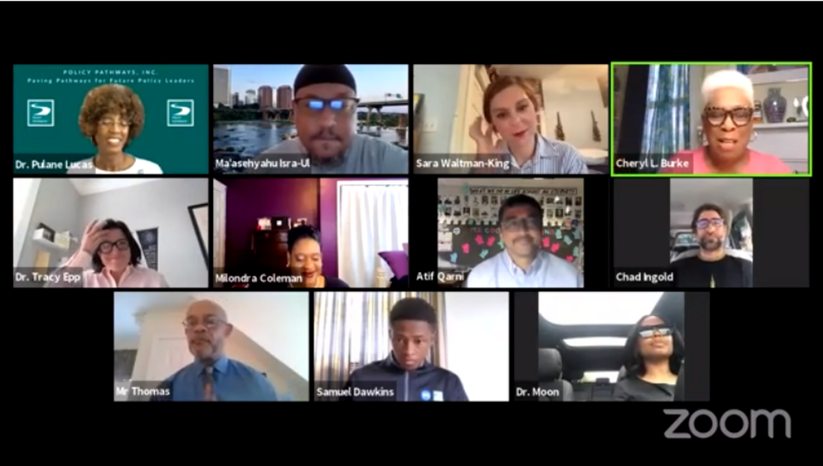 Policy Pathways promotes equitable access to high quality policy education. Its college preparatory year-round and summer programs are available to youth and young adults aged fifteen to twenty-five who are interested in making a difference in their communities and society. A signature program of the organization is its Policy and Society Year-Round College Preparatory Program offered in partnership with Richmond Public Schools. The credit-bearing semester-long course, Shaping Our Future: Policy Pathways, was offered Spring 2021 at John Marshall and George Wythe High Schools. One participant said, “The class helped me listen more and be more open about my responses. It also helped me look for key points and get a chance to talk to different people, see their point of view.”