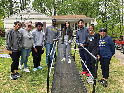 It is noon on a Sunday and students and chaperones from Godwin High School have created an assembly line to unload materials from a large box truck. Working as a team, they move from start to finish on the installation of a modular, metal wheelchair ramp on the front stairs of Tina’s home.