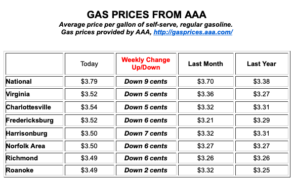 The national average pump price fell nine cents over the past week to hit $3.79. It has dropped daily since October 11, primarily due to lower oil prices and fewer drivers than usual fueling up. Virginia’s gas price average of $3.52 is down a nickel from last Monday, but up 16 cents from last month and up 25 cents from this day last year.