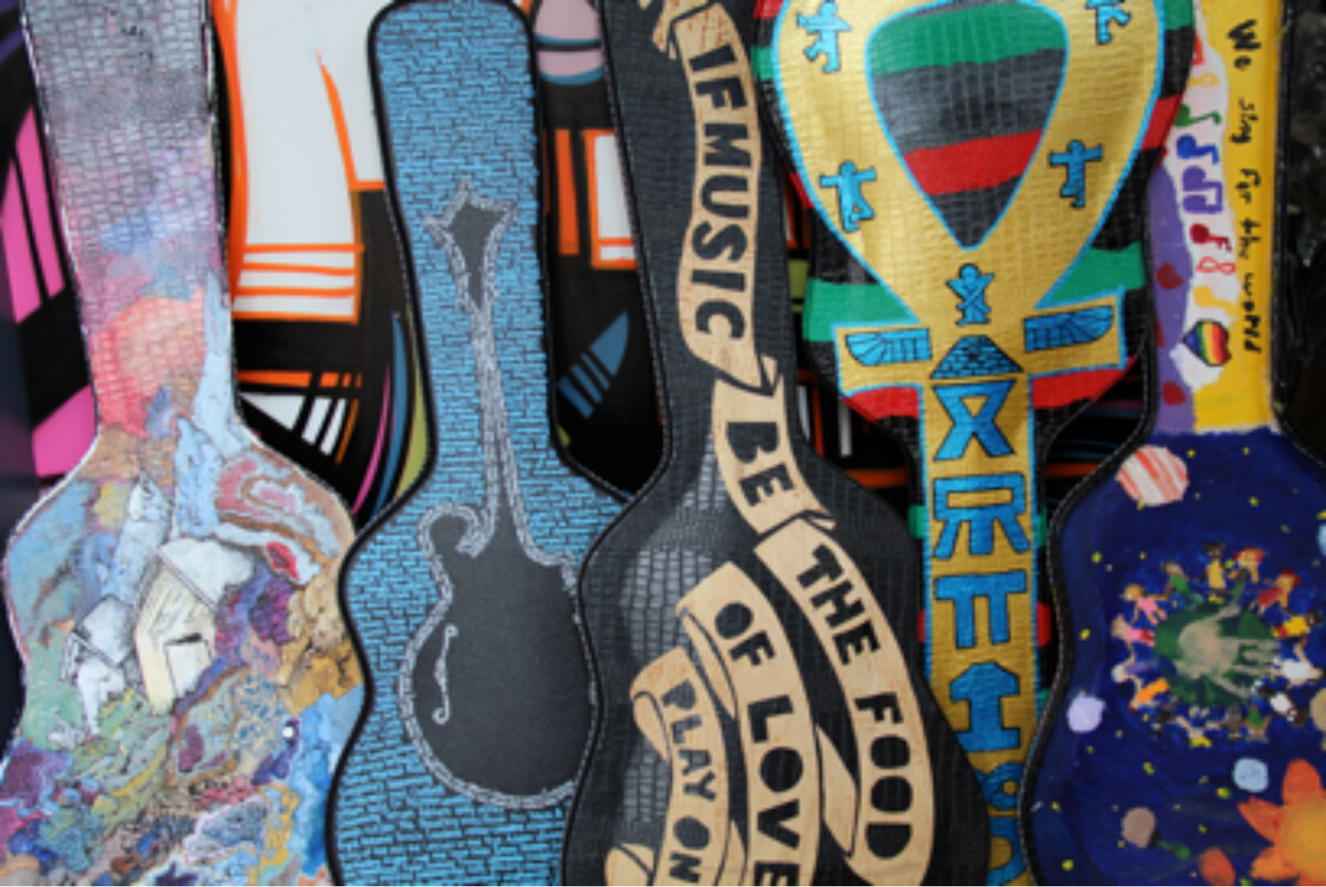 GuitART! A “Case” for Music and Art celebrates artist-musicians in honor of ART 180’s 15th anniversary, and features original art on guitar case lids donated by TKL/Cedar Creek, makers of musical instrument cases. Fifteen professional artist-musicians — visual artists who are also known for their musical abilities (or vice versa) — and 15 young artist-musicians designed original art pieces using the donated case lids.