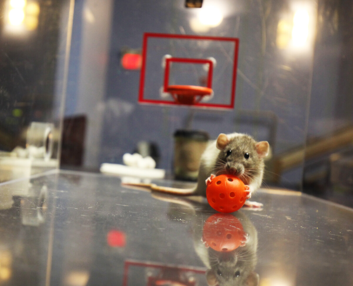 Trained rats go head-to-head on a miniature basketball court, representing the final four teams in the men’s NCAA tournament.