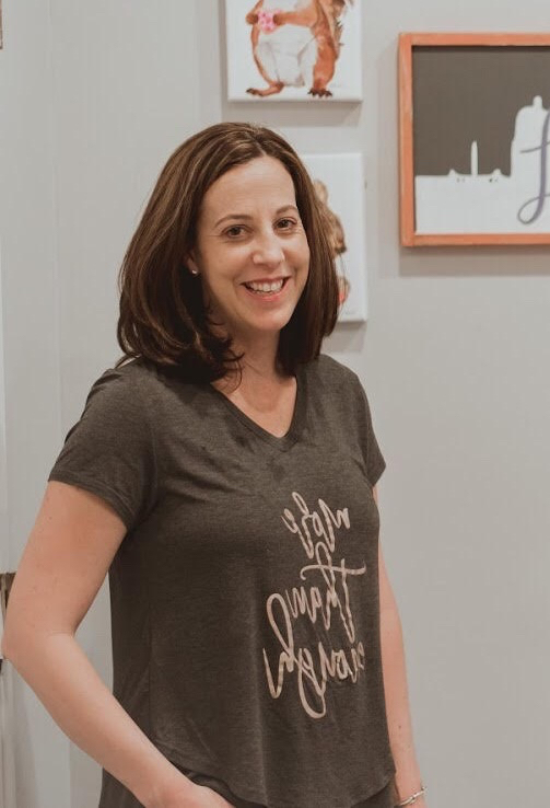 The soft pink and grey tones throughout the space are light, whimsical, and calming. The private nursing room is decorated with printed pictures of the Rockford Peaches, an all-female professional baseball team which served as the inspiration for the 1992 film A League of Their Own. One of the walls in the suite also sports a hand-painted quote from the legendary MLB catcher, manager, and coach, Yogi Berra.