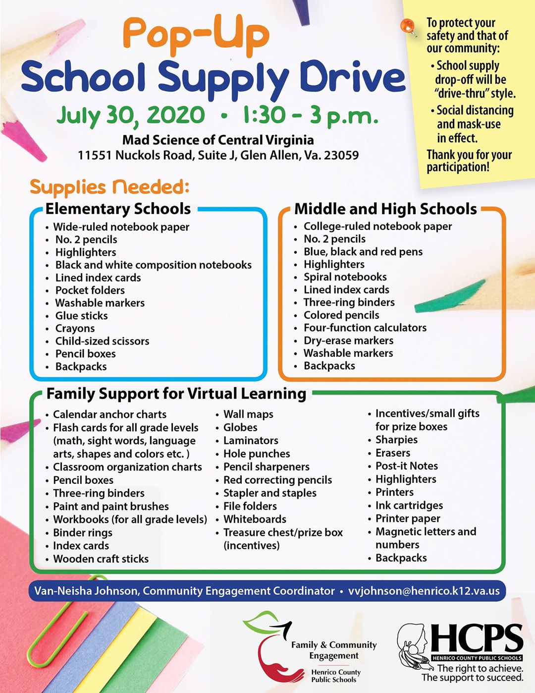 Thursday, July 30, HCPS office of Family and Community Engagement will host its first school supply drive at Mad Science on Nuckols Road.