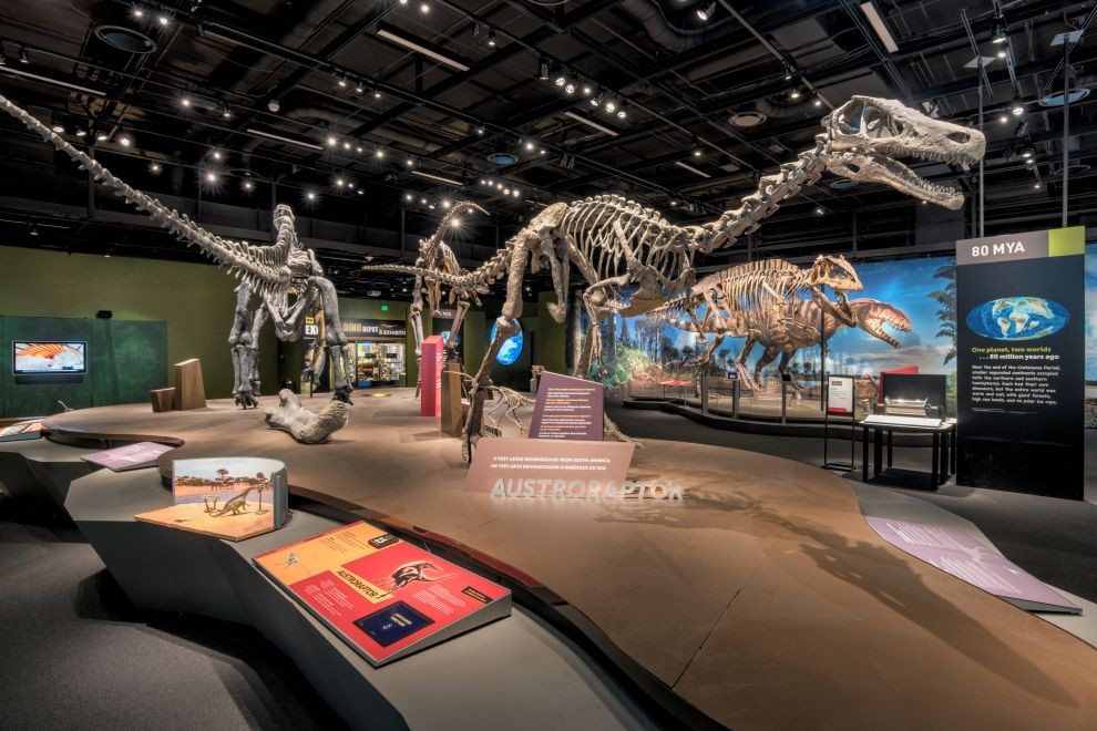 The new Ultimate Dinosaurs exhibit at the Science Museum of Virginia in Richmond transports visitors back into a world dominated by prehistoric giants. This interactive display, located in the museum’s Dewey Gottwald Center, features sixteen fully mounted dinosaur specimens from southern continents, and explores the diverse adaptations they developed to survive the separation of the supercontinent Pangea.