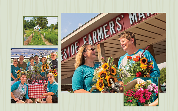 Kelly’s mom Dedee helps cut flowers. She and Sara’s mom Linda, aunt Betty, and cousin Margaret create floral centerpieces and help at events. As the resident handyman, Sara’s dad fixes things. He also made their sign. Kelly’s dad helps with cows and chickens, and offers lots of moral support. Blair, Kelly’s sister, runs a side business selling goat milk, cheese, and soap. Kelly’s grandma Alice, in her eighties, helps with the flower stands at local markets. Kelly’s niece Libbie enjoys picking flowers. Even 6-year-old Harry, Kelly’s nephew, helps with planting and seeds. He likes to go to the markets with them where he proudly identifies himself as “the flower farmer.”