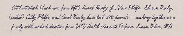 “We’ve lost [the equivalent of] a whole person, as each one of us used to weigh almost that much,” says Vern Phelps, a Prince George County employee who shed 152 pounds by following the same low-carb, high-fat eating program as his wife, Cathy Phelps, who lost sixty-eight pounds. Cathy’s father, Hassel Woosley Jr., the first in the family to enroll in the VCU Medical Weight Loss Clinic, dropped eighty-three pounds. His wife, Carol Woosley, lost thirty pounds and their daughter, Sharon Woosley, is sixty-five pounds lighter.