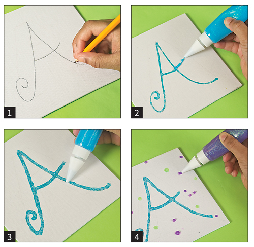 2. After choosing a glitter glue color, draw over your pencil lines with a solid line of glue.