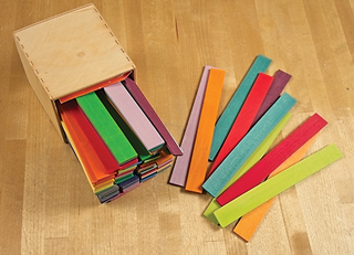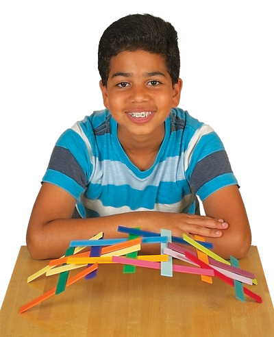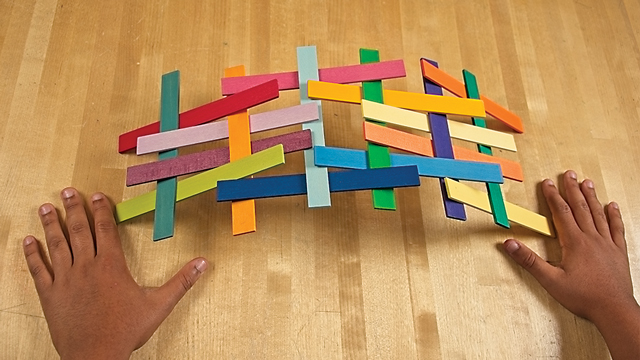 Hint: Using the same color sticks as you see in the picture may be helpful. Also, it helps to have two people building, as parts of the bridge may start slipping once you get a few sections built. There are several different ways the parts could fit together. Experiment with it! Look up Da Vinci Bridge online for other similar options to try.
