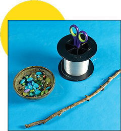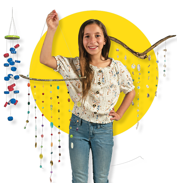 Take it further: There are many creative options! Substitute the branch for a hanger or jar lid (tap small holes into the lid using a hammer and nail). Instead of beads, try upcycling bottle caps, nuts, bolts, and washers. You might also use old keys, flatware, seashells with natural holes, and other items. Use your imagination and supplies from around your home to create your one-of-a-kind wind chime.