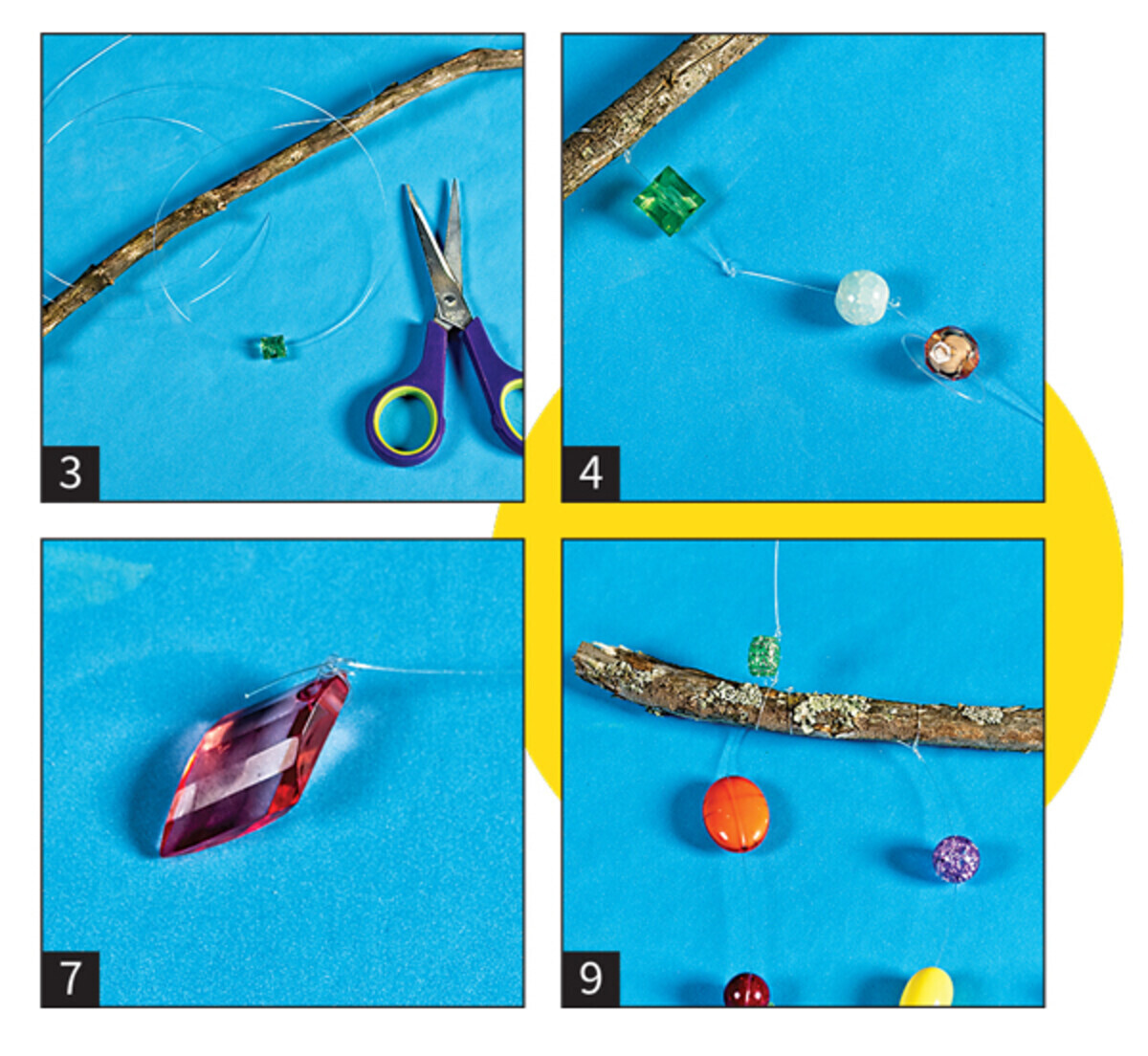 9. When all drops have been completed, tie another piece of fishing line to one end of the branch, securing it with a knot on top of the branch. Tie the other end to the opposite end of the branch to create a line for hanging your creation.