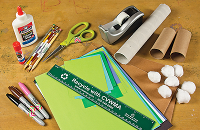 • Gather a variety of materials headed for the recycling bin: cereal boxes or thin cardboard, water bottles or milk cartons, plastic jars, and other materials from around the house.