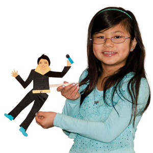 6. Your rock star legs and torso should be able to twist. Now draw and cut out more shapes to add a neck (rectangle), head (oval), hands, shoes, and even hair to the King of Rock. |