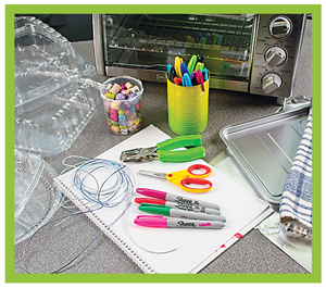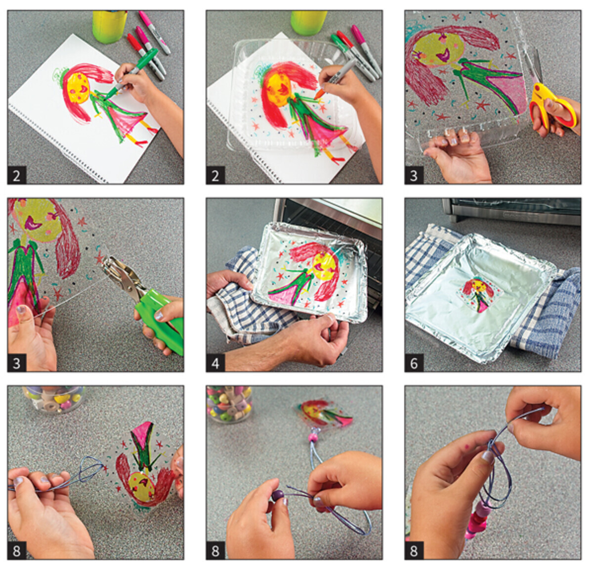 2. While the oven preheats, draw a design onto the #6 plastic using permanent markers. Make sure to draw this as large as you can. Your design will shrink by almost 75 percent when heated.