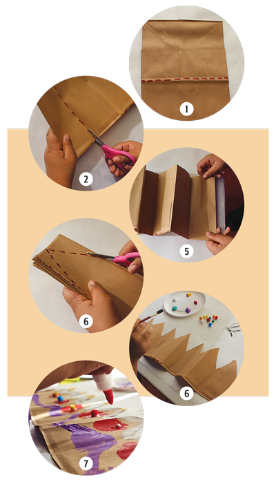 1. Draw a horizontal line to divide paper bag in half. Cut along the line and discard the bottom half of bag. (Try using the bottom half for another craft.)