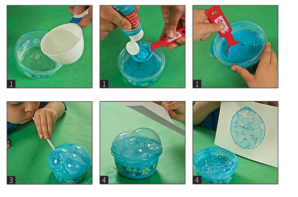 3. Before anyone’s mouth gets near a straw, remind children to blow into the mixture and not to suck up the paint/soap mixture. Now, ask them to gently blow into the mixture and create bubbles.