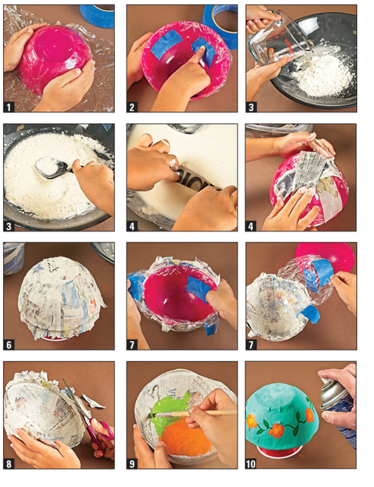 7. Remove the tape holding the plastic wrap to the plastic bowl form, and gently lift hardened shape from the form. Carefully remove the plastic wrap from the inside of the papier maché bowl.