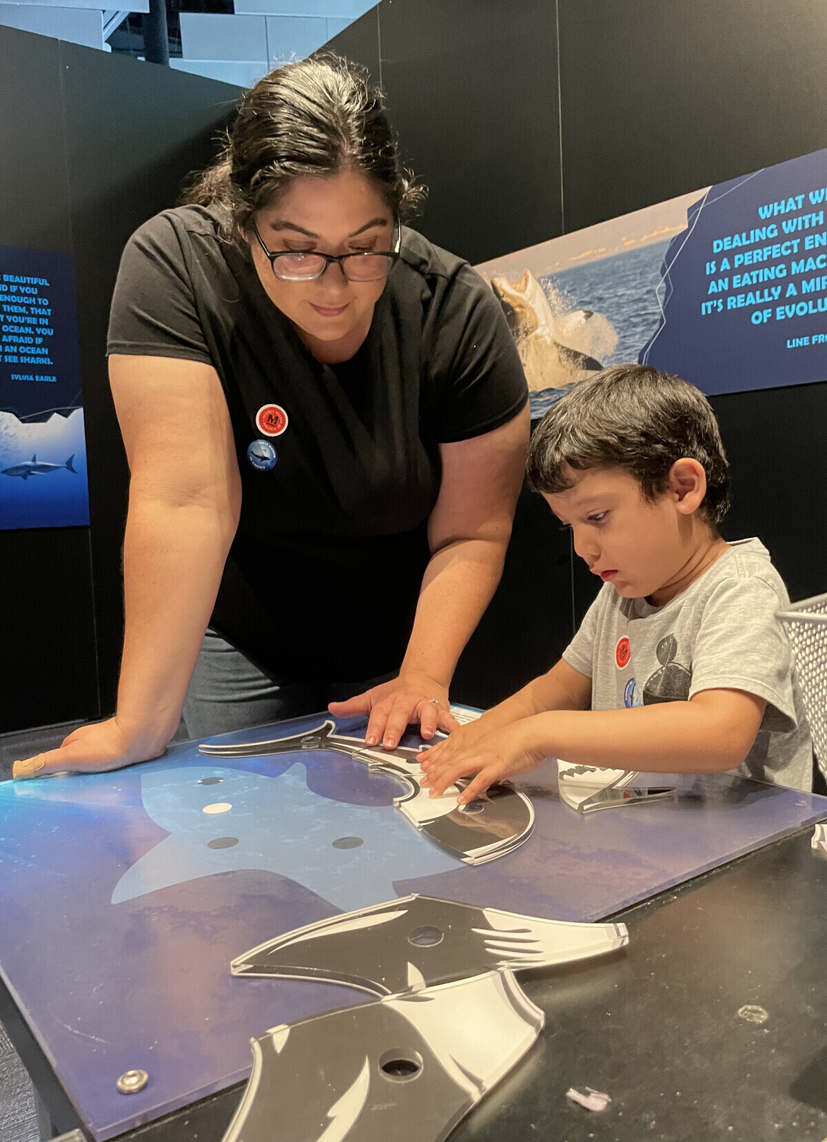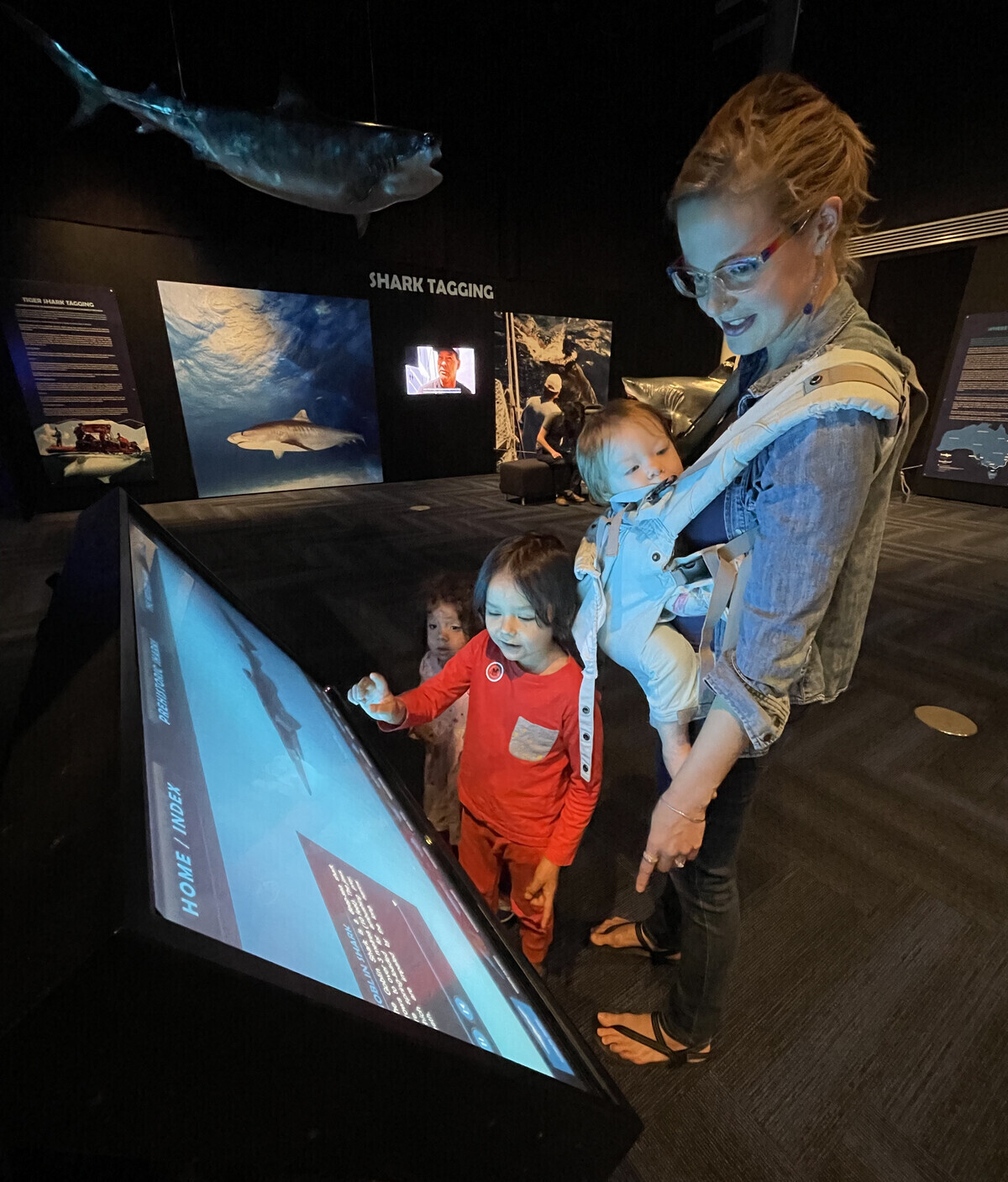 As you continue through the exhibition there are interactive screens that take you through the various species and evolution of sharks, a crayon-rubbing station for littles so they can take home an image of they’re favorite type of shark, and a station where a volunteer has real artifacts from sharks that you can touch.