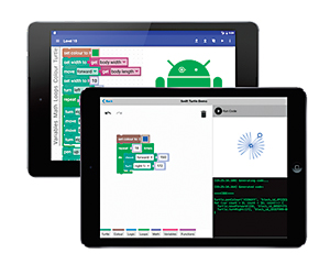 Google Blockly Students build code by dragging blocks on the screen. The nice thing about Blockly is that it outputs syntactically correct Javascript. It’s a nice bridge into the world of genuine programming. ($, ages 8+, requires adult-led instruction)