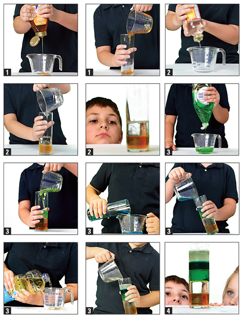 4. Make some observations. Did you correctly guess which liquids would float and which would sink? When you are done, all the liquids in your glass will be in order from top to bottom – the least dense to most dense.
