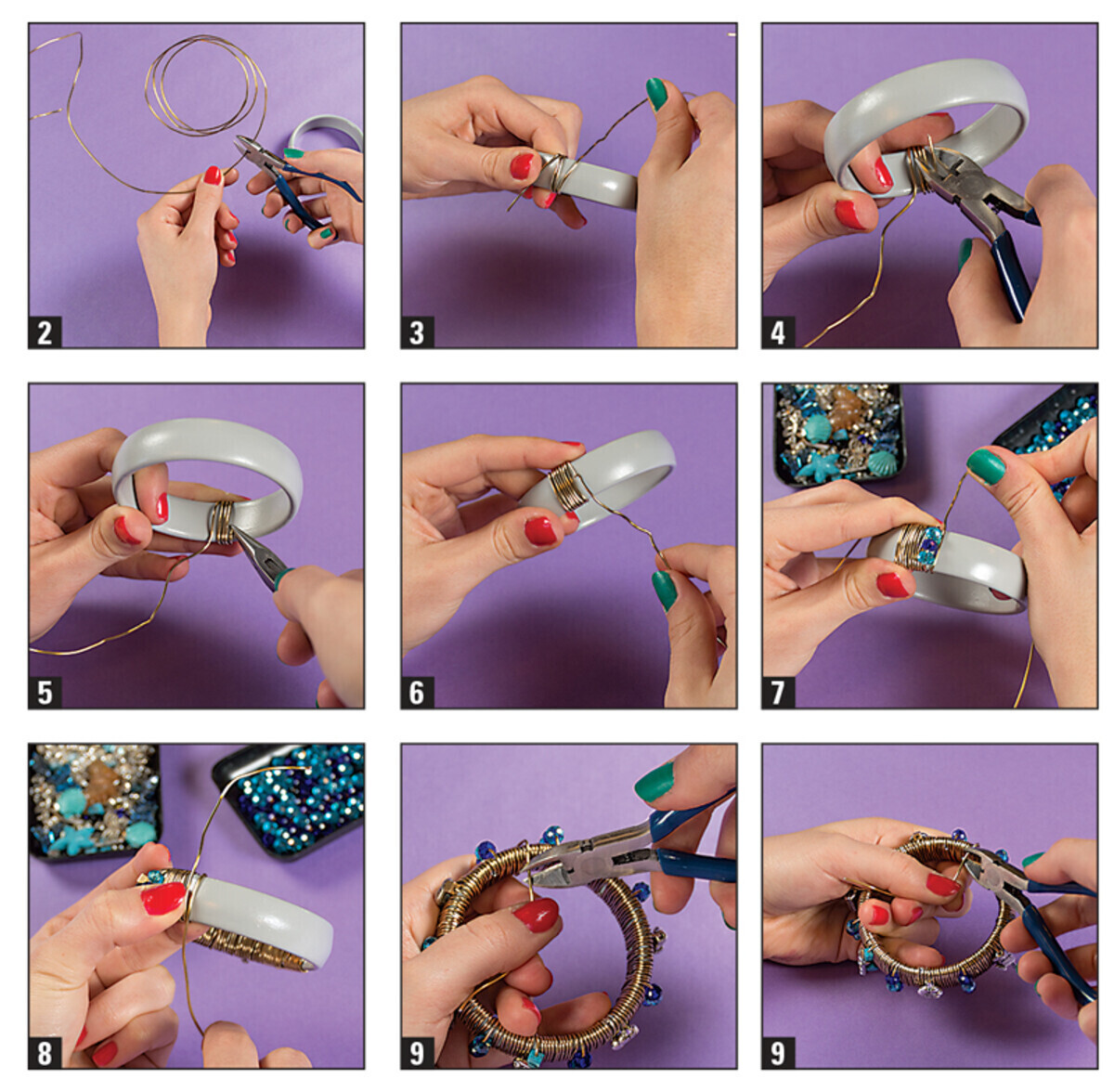 8. If you run out of wire, simply add more. Use your pliers to press the end of the wire firmly against the bangle, as flush as possible. Cut more wire and continue wrapping your bangle.