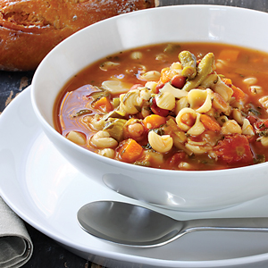 In a large Dutch oven or stockpot, warm 3 tablespoons olive oil over medium heat. Once oil is simmering, add chopped onion, carrot, celery, tomato paste, and a pinch of salt. Cook, stirring frequently until the vegetables have softened and onions are translucent, about 7 to 10 minutes. Add your choice of seasonal vegetables, garlic, oregano, and thyme. Cook for an additional 2 minutes. Mix in diced tomatoes and their juices, broth, and water. Add salt, bay leaves, and red pepper flakes. Season to taste with freshly ground black pepper. Increase heat to medium-high and bring the mixture to a boil, then partially cover the pot with your lid, leaving enough room for steam to escape. Reduce heat as needed to maintain a gentle simmer. Cook for 15 minutes, then remove the lid and add the pasta, beans, and greens. Let the soup continue to simmer uncovered for 20 minutes, or until the pasta is cooked and greens are tender. Remove the pot from the heat, and remove the bay leaves. Stir in lemon juice and remaining tablespoon of olive oil. Garnish bowls of soup with grated parmesan if you would like, and enjoy.