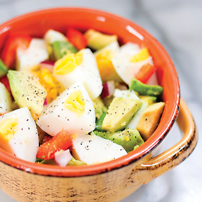 Combine eggs, avocado, onion, and bell pepper in a bowl. Sprinkle on sea salt and ground pepper. Serves 1.
