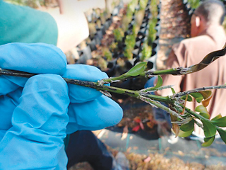 To make a proper diagnosis, it is important to learn about this highly infectious disease. First, leaves and branches infected with boxwood blight have light or dark brown leaf spots, bordered with a dark edge that is easily visible. In comparison, plants suffering from winterkill (stress from this year’s inconsistent weather) do not have the ringed brown leaf spots. Second, infected branches or stems develop long blackish brown streaks that are easy to see. Third, as the humidity rises, the fungus produces clusters of white spores that look like little cotton balls on the underside of leaves and on the infected stems.