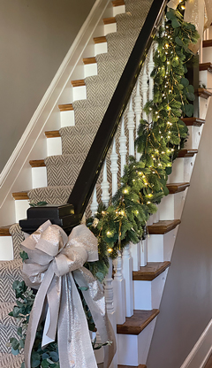 An easy and beautiful way to bring natural elements indoors is to incorporate fresh greenery into your mantle. For an update on a classic look, fresh evergreen swags can be accented with large ribbon and small LED lighting. Add two large poinsettias to either side of the mantle to help make it a focal point of your home. If you don’t have a mantle, try some creative styling on a front entry table or add decorative items to the top of a bookshelf. Sometimes I’ll decorate a lighting chandelier, too, to draw the eye up.