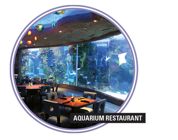 You’ll dine in what seems like an aquarium with an amazing array of tropical fish including sharks, rays, and eels. Go more for the surroundings than the pricey food, but there is a kid’s menu.