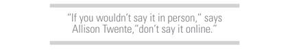 The irony, Twente notes, is that while someone posting a nasty comment online might feel freer to do so because he isn’t standing in front of his target, the person on the receiving end often feels worse for the exchange than she might have had it happened in person.