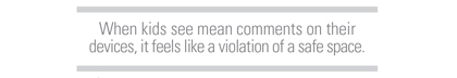 Carr says issues can arise as early as upper elementary school, but most often in middle school, as students begin to develop their own identities, separate from parents and families. Because they’re young, they make mistakes, he says. “Their expression is often not as mature as in high school,” he says. “When they have access, it’s not always used constructively, because there’s no immediate consequence; there’s no face-to-face [interaction], there’s no body language.”