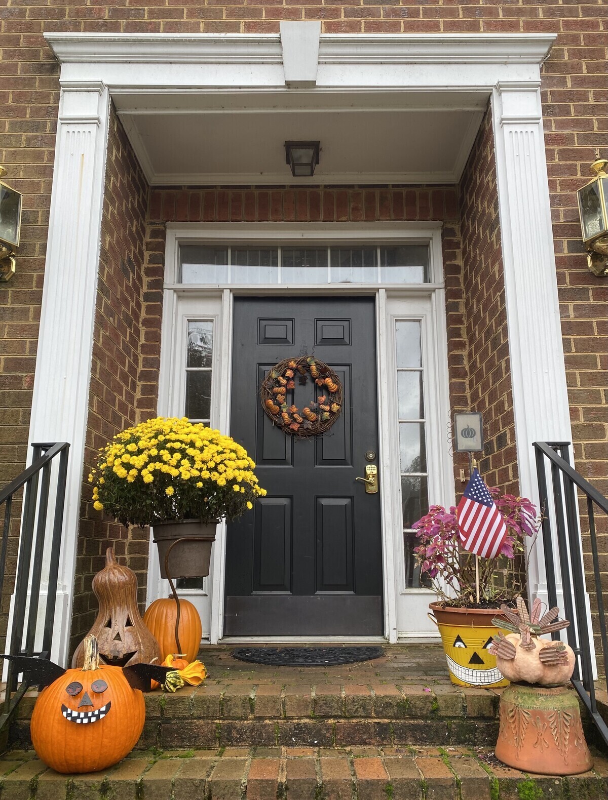 My fall porch. Several years ago, I found the perfect handcrafted plant stand at Arts Around the Lake at the University of Richmond. After trying to talk myself out of spending so much money on something for myself, I bought three and gave the other ones to my mom and my mother-in-law for Christmas. Now, we all have to find the perfect plants and gourds and arrangements to put on our porches so our very cool plant stands don’t look underdressed.